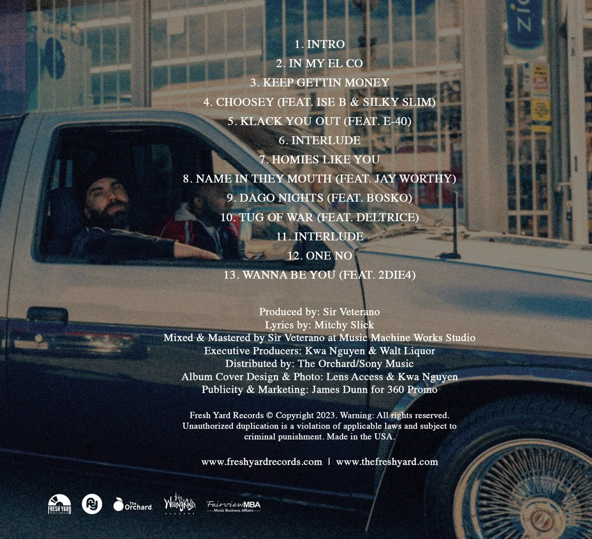Southeast San Diego, CA rapper Mitchy Slick presents the Niko Alexzander-directed music video for "Keep Gettin Money", the new single from Everybody Hates Mitch, Mitchy's new collaboration album with Central Valley, CA producer Sir Veterano. The "Money" visual comes on the heels of music videos for Everybody Hates Mitch singles "Dago Nights" (watch the music video) and "In My El Co" (watch the music video). Making its mark heavily in a micro-genre Sir Veterano coins "sweaterfunk", the album features guest appearances from E-40 (stream "Klack You Out" on Spotify) as well as Jay Worthy (stream "Name In They Mouth" on Spotify), Ise B, Deltrice, Bosko, 2die4 and Silky Slim. San Diego rap stalwart Mitchy is CEO of Wrongkind Records, a familial collective of rappers, deejays and artists (watch the music video for "Imperial" featuring OsoOcean). Mitchy is a member of the rap supergroup Strong Arm Steady, along with rappers Phil Da Agony and Krondon. In 2021 Mitchy released 23 Blocks (stream the album on Spotify). In the past he's collaborated with artists such as Lil Wayne, Nipsey Hussle, and The Game, whose Documentary 2.5 featured three guest shots from Mitchy. In 2021 Sir Veterano released The Gathering (stream on Spotify), featuring MC Eiht and Ras Kass, which was followed up by All Hail The King, his collab album with Fresno, CA emcee Fashawn (stream on Spotify). Sir Veterano is the premier producer on the roster of Fresh Yard Records, helmed by Vet's music manager, Walt Liquor, and Kwa Nguyen, also owner of Fresh Yard Clothing. Everybody Hates Mitch is inspired by the 80's West Coast cocaine rap era. Purchase the CD & digital album at freshyardrecords.com.
